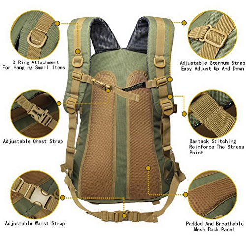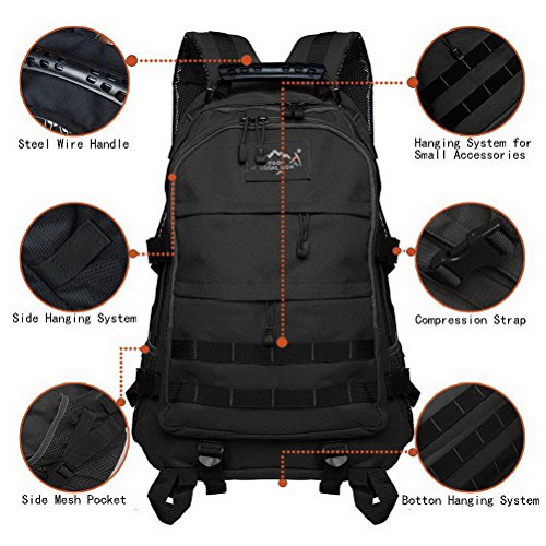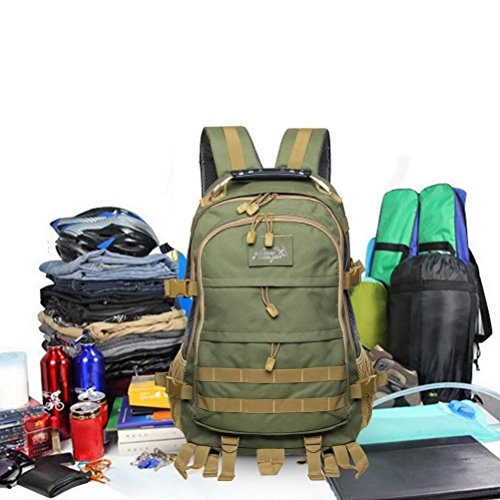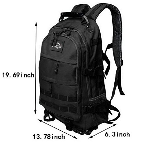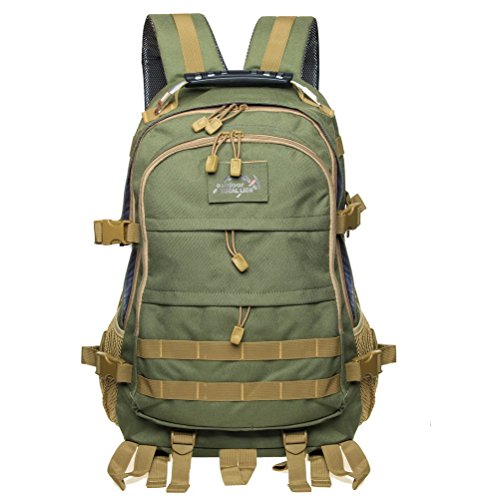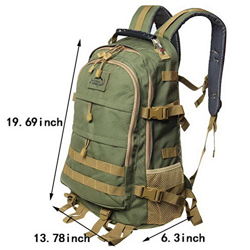 -. Binding : Misc. -. Brand : PioneerHiker -. Department : Mens -. Feature : 1.MATERIAL: Water Resistant Polyester. / 2.PRODUCT DETAILS: Capacity: 40L; Dimensions: 19.69*13.78*6.69inch(50*35*17cm);Weight: 2.38 lbs (1.08kg). / 3.MOLLE SYSTEM: You can take your needed gears easily and organized freely! Small items will be no longer a problem. / 4.BOTTOM HANGER: Bottom straps design - you could hanger your tent,sleeping bag, moistureproof mat. / 5.MAIN COMPARTMENT: Inner elastic pouch make it possible to take your laptop with you.The zipped access to the main compartment can up zip all the way down to the bottom,and give you an concenient way to store your gears. -. IsAutographed : 0 -. IsMemorabilia : 0 -. Label : PioneerHiker -. Manufacturer : PioneerHiker -. ProductGroup : Sports -. ProductTypeName : SPORTING_GOODS -. Publisher : PioneerHiker -. Studio : PioneerHiker -. Title : PioneerHiker Military Camo Backpack Tactical Backpacks for Hunting Camping Hiking Trekking