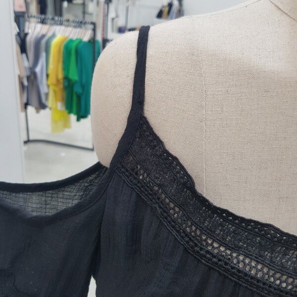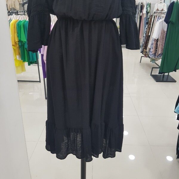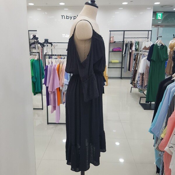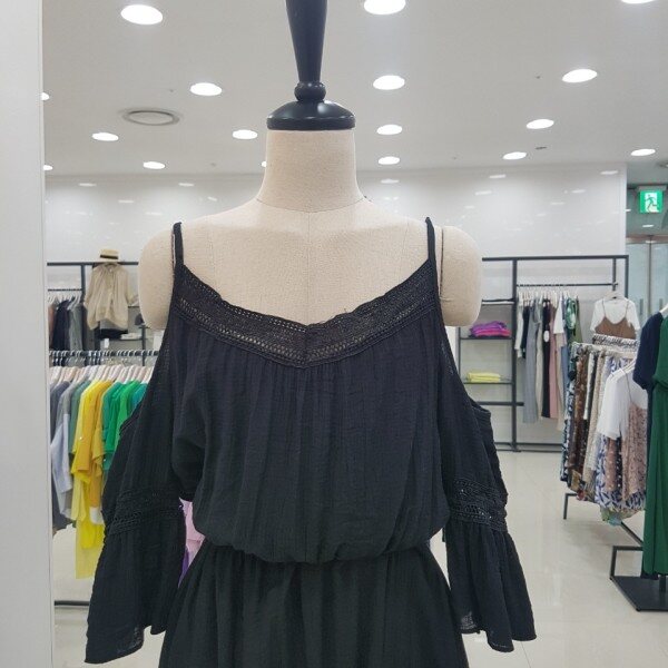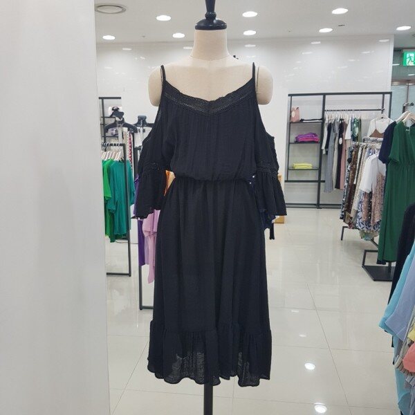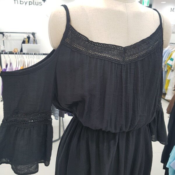 세련된 올블랙 원피스입니다.소매와 넥라인을 따라 들어가 있는 레이스가 더욱 세련미를 살려주는 아이템이에요.