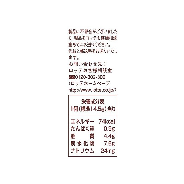 원재료:소맥분,설탕,쇼트닝,유당,전알,카카오 마스,물엿,코코아 버터,전분유,식물성 기름지,탈지분유,《호에이파우다》,양주,생크림,크림 파우더,식염,환원 물엿,덱스트린,솔《비토루》,주정,팽창 제,유화 제(대두를 포함한다)고, 향료