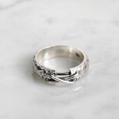 도톰한 볼륨감과 높은 퀄리티를 보여주는 반지입니다. 망치로 두들겨준듯 겉표면 텍스쳐가 유니크한 스타일입니다. 코르셋을 당겨주는듯한 스타일로 독특한 디자인으로 보여줍니다. 섬세하게 제작되어 높은 퀄리티가 매력적입니다. 남자분들이 착용해도 멋져요:) 자세한 사이즈와 디테일은 상세페이지를 통해 체크해주세요.