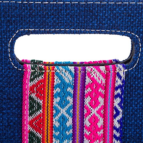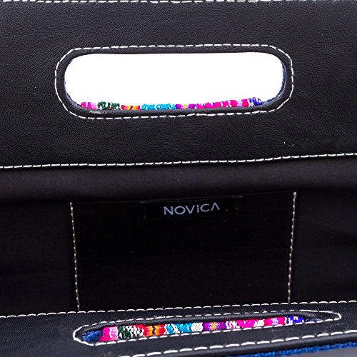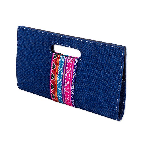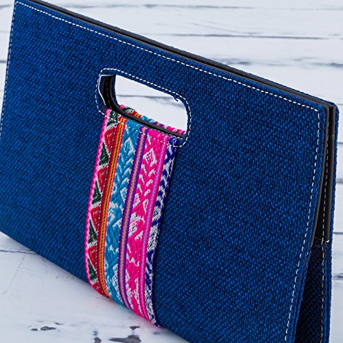About this item: Featuring a solid color in navy accented with multicolored geometric motifs inspired by traditional Andean designs, this clutch is crafted of cotton denim by Peruvian artisans, with a handle for easy carry. Arletti del Aguila designs the handbag, accented with faux leather on the inside of the handles. It opens with magnetic snaps to a black lining that features an open inner pocket for storing small items. - Dry clean only