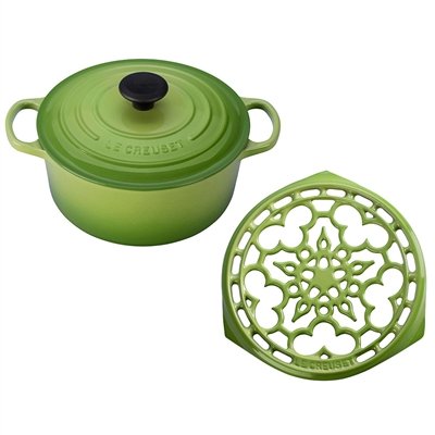 Create a gourmet vegetable soup or experiment with baking a loaf of bread with this Dutch oven and trivet set from Le Creuset. This round Dutch oven, also known as a French oven, is a versatile piece of cookware made from enameled cast iron. Cast individually in sand molds, then hand-inspected by French artisans, each cast iron piece features a rich heritage design, as well as ergonomic knobs and handles -- which are sized for easy carrying with pot holders. Ideal in the oven, on the stove or at the table, this iconic cookware is beloved for both its chip-resistant enamel exterior and superior heat retention that locks in flavor and keeps foods moist and tender. Dishwasher safe, this Dutch oven is backed by a manufacturer's limited lifetime warranty. This Dutch oven comes with a deluxe round trivet. Made from matching enameled cast iron, this trivet is perfect for serving hot, out of the oven dishes without burning or warping your counter and table tops.4.5 quart Dutch oven -- 10" diameter x 6-1/2" H; Trivet -- 9" diameter