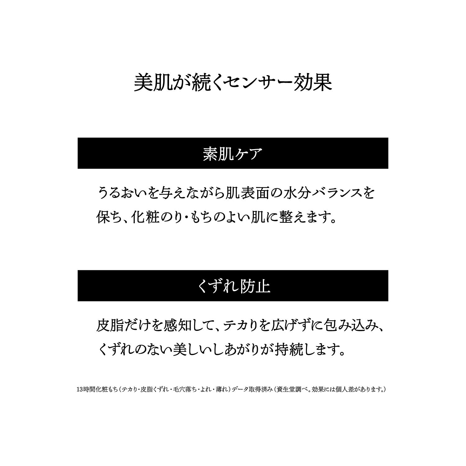 肌の水分バランスと皮脂をコントロールするセンサー効果で、つけたての仕上がりよりも美肌印象へ。 くずれのないさらりと美しい肌が1日続く。 13時間 化粧もち(テカり・皮脂くずれ・毛穴落ち・よれ・薄れ)データ取得済み(資生堂調べ。効果には個人差があります。)