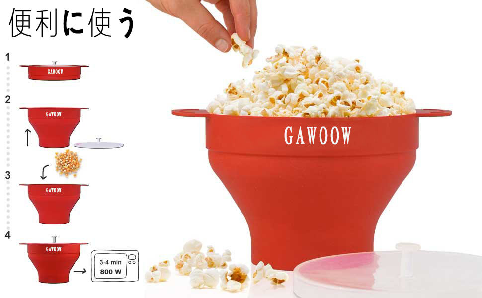 本体中央部が計量カップ代わりとなるので、適量のコーンを入れて、クリアの蓋を載せたらレンジで加熱。600ワット・2分半でノンオイルのポップコーンが完成します