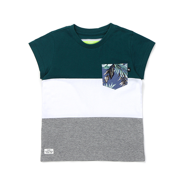 얇은 소재를 사용해 착용감이 부드럽고 포켓에 야자수패턴을 포인트로 사용한 배색절개 티셔츠입니다.