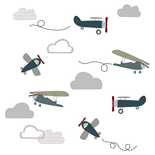 -. Feature : What better way to complete this nursery collection than our easy-on, easy-off wall appliques. / They come in 4 sheets of 17.5" x 9.5" and depict several airplanes, clouds of varying sizes and colors, and trails of flights. / Peel & stick. Wipe clean