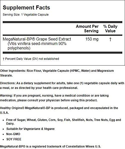 Directions As a dietary supplement for adults,take 1 capsule daily with a meal,or as directed by a physican. Supplement FactsServing Size: 1 CapsuleAmount Per Serving% Daily Value***MegaNatural - BP Grape Seed Extract (Vitus vinifera seed minimum 90% polyphenols)150 mg* *Daily Value Not Established ***Percent Daily Values are based on a 2,000 calorie diet