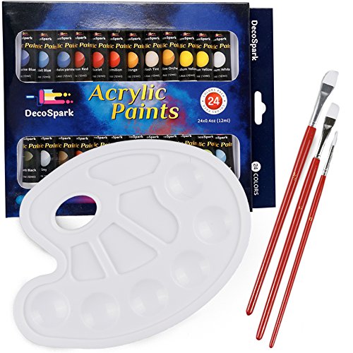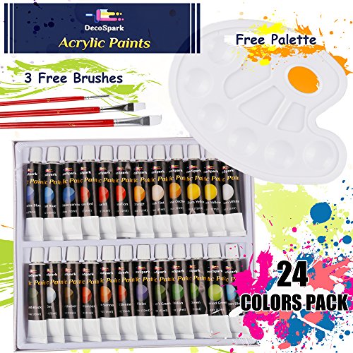 Acrylic Paint Set - 24 X 12ml Tubes, 3 Free Brushes And Palette | Rich Pigment, Non-Toxic | Painting on Canvas, Wood, Ceramic, Fabric | Perfect Paints For Kids, Beginners And Professionals | Decospark