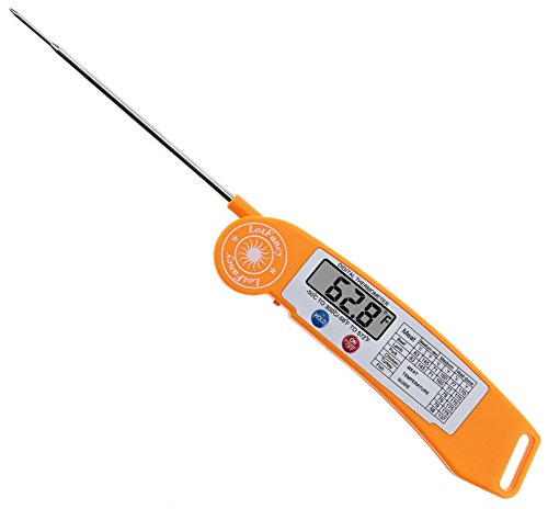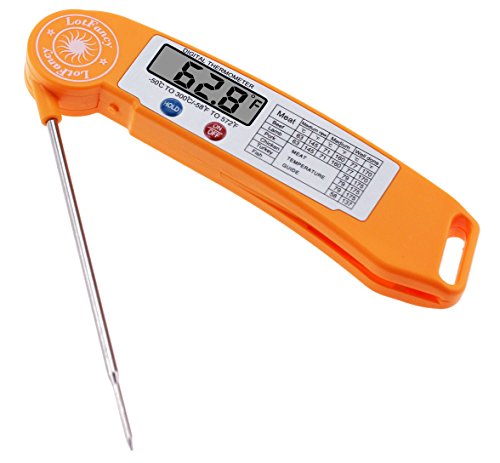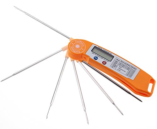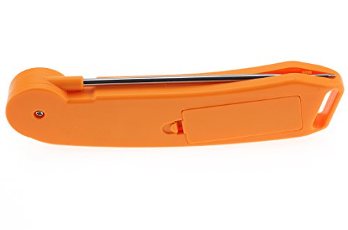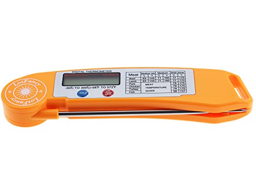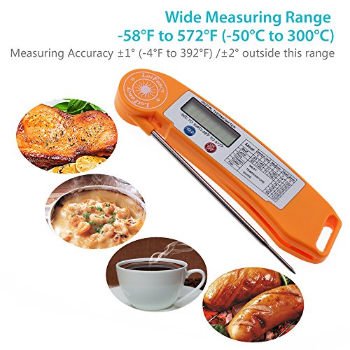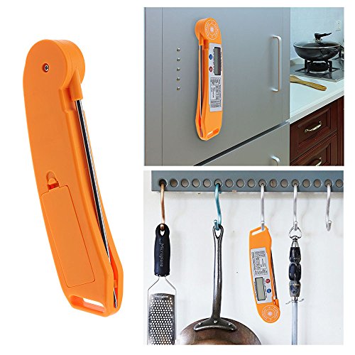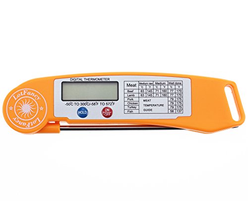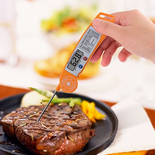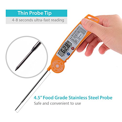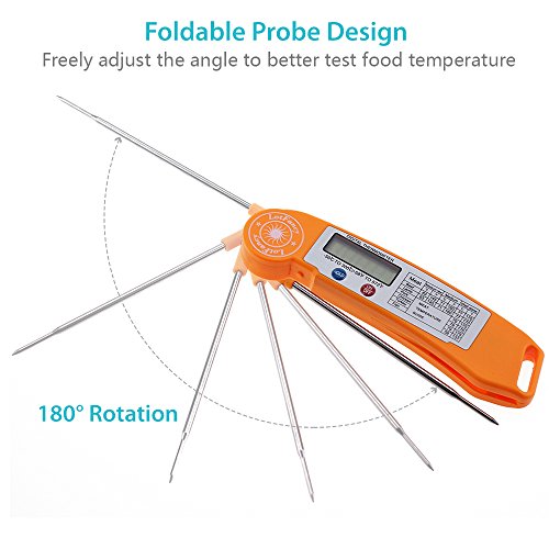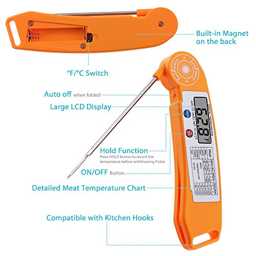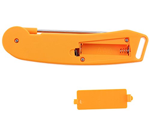 Operation Tips -One AAA battery (not included) is required before using the digital thermometer. -Shift the toggle switch under the battery cover to set the default to Fahrenheit or Celsius. -Insert the probe into the thickest part of the food to measure the temps. -Press the HOLD button so you can remove the thermometer from your meat and read the temperature outside the heat of the oven. -A detailed meat temperature chart printed on the thermometer for quick reference of the ideal temperature to cook beef, lamb, pork, steak, chicken, turkey or fish. -Get an accurate interior temperature of food in 4 to 8 second. Helpful Tips Digital thermometers are not meant to be left in food during cooking. The plastic and electronic components could be damaged with excessive heat. Product specifications Case material: food-safe ABS plastic. Probe material: stainless steel. Measure range: -58°F to 572°F (-50°C to 300°C) Length: 10.23 inches (260 mm). Net length of probe rod 4.33 inches (110 mm). Probe diameter 0.13 inches (3.5 mm), folded size 5.9 x 1.7 x 0.8 inches,(15 x 4.5 x 2 cm), unfolded size 10.6 x 1.7 x 0.8 inches,(27 x 4.5 x 2 cm). Package includes 1 x Food thermometer 0