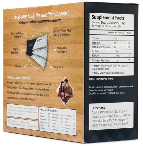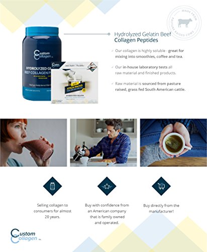 Common uses for this product: Joint pain, Hair and nail strength, Alternative to soy or whey protein, Skin tone, Surgery recovery, Hashimotos, Leaky gut syndrome, Celiac disease, Paleo applications, and much more! This is a premium collagen peptides product that has gone through several in-house testing processes to assure that our quality and purity standards are exceeded. There is absolutely nothing added to this product. When you order a carton on our Beef Collagen Peptides Stick Packs, you will receive just that! How do we know? We are a gelatin and collagen manufacturer! We see the process from start to finish. We source the material for this product from South American cattle farms that pasture raise their livestock. In addition to our extensive laboratory tests, each jar is weight checked, goes through metal detection and is tamper evident sealed. This product will easily dissolve in anything with ample liquid. Tea, coffee, yogurt, stew, lemonade, soup, pasta sauce, salsa, you name it! What are your waiting for?! Purchase this product today and start improving your health! Our collagen can be used as an essential daily dietary supplement to support joint and skin health. Collagen as a dietary supplement can support joint function and flexibility, muscles, energy and endurance, recovery time after physical activity, nail and hair strength, and skin tone. Collagen is simply hydrolyzed gelatin. There are no MSG or artificial ingredients added. This product is naturally gluten free because it is derived from the skin, connective tissue and bones of animals. The only ingredient in this product is hydrolyzed gelatin. There are absolutely no additives, fillers or preservatives. There is no need to worry about MSG, GMOs, etc. When this product is stored in a cool, dry place, it has an indefinite shelf life.Feature