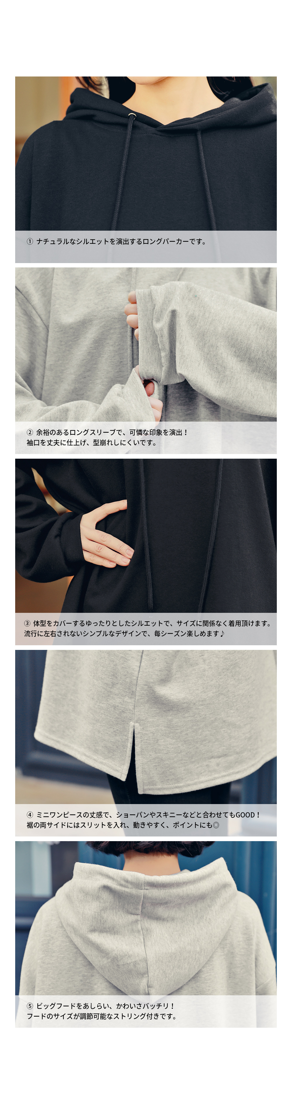 一着での着用でもスタイリッシュに決まるロングパーカー。ミニ丈で脚長効果も◎パンツやスカートと合わせても可愛いアイテムです。ショルダーラインに沿ってナチュラルに落ちるシルエットが女性らしいさをUP♡オーバーフィット感でサイズ関係なくどなたでもスタイリングいただけます。シンプルなデザインでいつどこでもラクちんなオシャレが楽しめるデイリーアイテムです。
