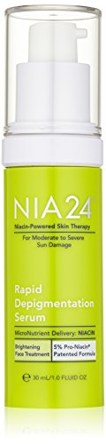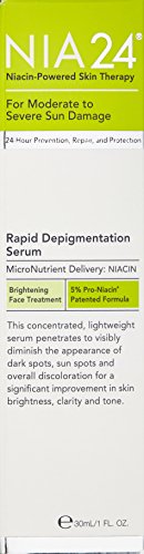 Nia 24 Rapid Depigmentation Serum is a concentrated serum with clinical strength Pro-Niacin that diminishes the appearance of spots and discolorations. Pro-Niacin and lyrosinase inhibitors, Vitamin C and Hexylresorcinol help to normalize melanin in the skin to improve the appearance of skin tone, texture and hyperpigmentation.