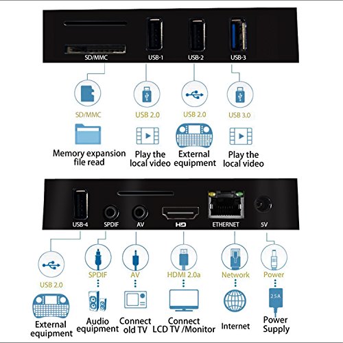 -. Feature : ANDROID - Carrying Android OS 7.1 System / KODI AVAILABLE - Kodi 18.0 version pre-installed / BLUETOOTH - Support Bluetooth Connection, built-in bluetooth v4.1 / WIRELESS - 2.4G /5G dual-band Wifi, Built in Antenna with 2T2R, support 802.11ac wifi agreement / 4K ULTRAHD - 4096x2160 True 4K, RK3328 Quad-Core 64 bits Cortex A53, high quality of outputing powerful graphics processor, experience the fun of rapiadly