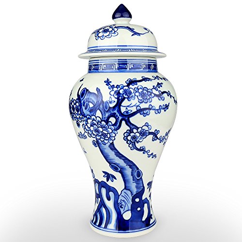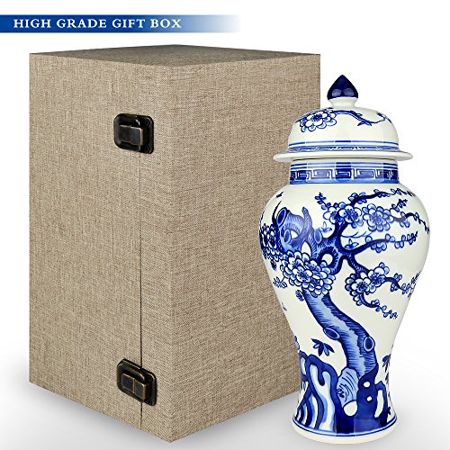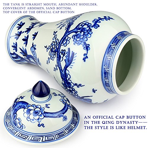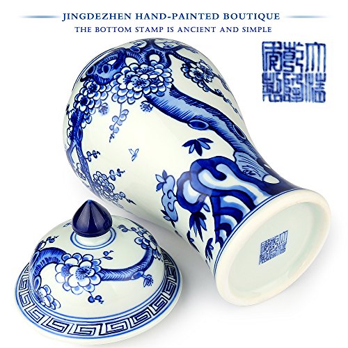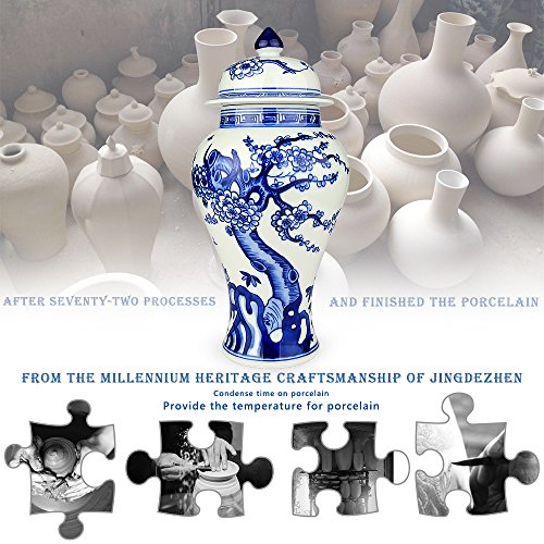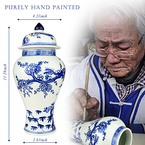 XUZOU Blue and White Porcelain Ceramic Temple Jar Vase,Oriental Handpainted Chinese Ginger Jar from Jingdezhen - 11.34 inch Tall