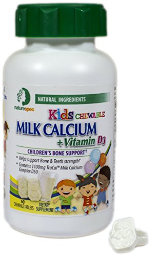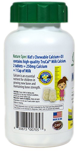 Nature Spec Kid's Chewable Milk Calcium Calcium is the most abundant mineral found in a child's body, with 99% calcium being found in their teeth and bones. Nature SpecTM Kid's Chewable Milk Calcium + Vitamin D3 formula contains high quality TruCal®milk calcium, it has the correct balance of minerals required for maximum bone growth and maintenance. For better calcium absorption, Nature SpecTM combines Vitamin D3 and Zinc. These nutrients help support and establish the very foundation of your child's structural growth! Calcium benefits for children . Essential for normal bone and tooth development . The cardiovascular and nervous system both use calcium . Vital for blood clotting . Keeps bones strong . Calcium is required for the body to function normally and to think. Nature SpecTM Kid's Chewable Milk Calcium Advantages . Chewable tablets . Vanilla Flavored with a great taste kids will love . Contains TruCal® Milk Calcium . TruCal® Milk Calcium contains the correct balance of minerals required for maximum bone growth and maintenance . Contains Vitamin D3, which helps with calcium absorptionFeature