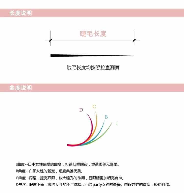 此款睫毛JBCD四种曲度,在长度相同的情况下,J的手感很柔软,长度方面越长的摸起来越柔软,道理如同人的头发,长点的感觉软,拉直的也会感觉软,短毛寸打卷的手感硬一点,但是无论是哪种都是0.15粗度当中很柔软的!