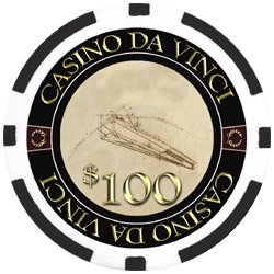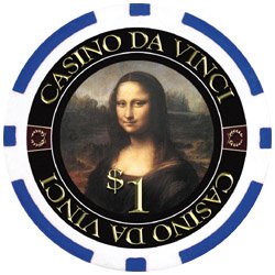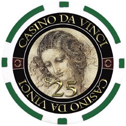 Each chip is this unique Da Vinci Masterworks set features a full color reporduction of Leonardo Da Vinci's greatest works of art or sketches. This set includes 500 11.5 gram clay-ABS composite chips with dollar denominations, a sturdy aluminum chip case, 5 dice, 2 decks of playing cards, 3 dealer buttons, and 2 cut cards. Play poker in style with these elegant and unique chip set. The chips are denominated in standard casino values and colors of Blue $1, Red $5, Green $25, Black 100, and Yellow $500.