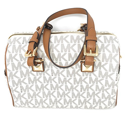 -. Brand : -. Department : womens -. Feature : Signature PVC with leather trim; Gold-tone hardware / 11.5" W x 8" H x 7" D - Measures medium / Top handles with5" drop; detachable adjustable shoulder strap / Zip-top closure; two exterior side pockets; flat bottom with protective feet / Interior lining features zip,cellphone and multi-function pockets -. Model : 35H4GGYS2B -. ProductGroup : Shoes -. ProductTypeName : HANDBAG -. Title : Grayson Medium Satchel Signature