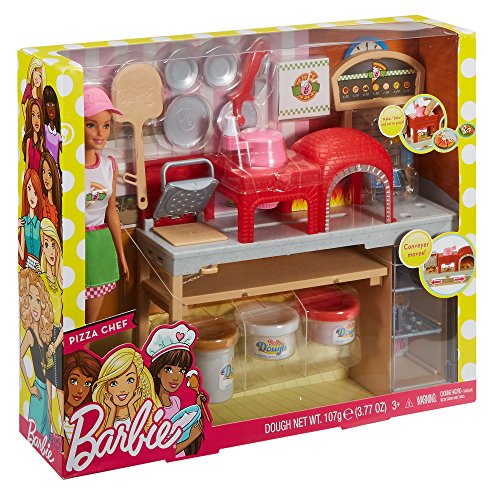 Barbie pizza chef doll is ready to cook up fun with a pizza shop play set, three colors of dough and accessories that let kids make their own doll-sized pizzas! Young foodies can press the dough, add "sauce" and "cheese," then slice and serve once they've collected payment at the register, of course! A sliding conveyor belt keeps the food and imaginations moving on this pizza maker. Start with the beige dough and the tomato-colored dough: use the pizza press to flatten a pizza crust and sauce on the conveyor pan. Slide the belt lever and the pizza along until it rests under the cheese grater. Add "cheese" using the white dough: press into the shredder and once the grater is locked into position, turn the hand crank to sprinkle the topping onto the pizza. Then move the lever again and slide the pizza into the oven with its fiery backdrop. When you think it's done, use the pizza slider to move the pizza onto its pan and cut it up with the pizza slicer. Serve a slice up on a plate (there are two) or place it in the pizza box for take-out. Three drink selections -- that fit on Barbie doll's hand -- are extra-fun ingredients for play. Store leftovers in the mini fridge below the counter; a shelf under the belt adds additional storage space. Barbie pizza chef doll is ready to serve up her best pizza wearing a pizza-themed white top, a pink and white checked skirt, a green apron, pink shoes and a pink cap. With so many fun features and pieces, this pizza shop play set offers all-day play and a world of exploration because with Barbie, you can be anything! Includes Barbie doll wearing pizza chef fashion and accessories, pizza shop with stations and working features, three colors of dough and themed pieces that include utensils and a register. Doll cannot stand alone. Colors and decorations may vary.Feature