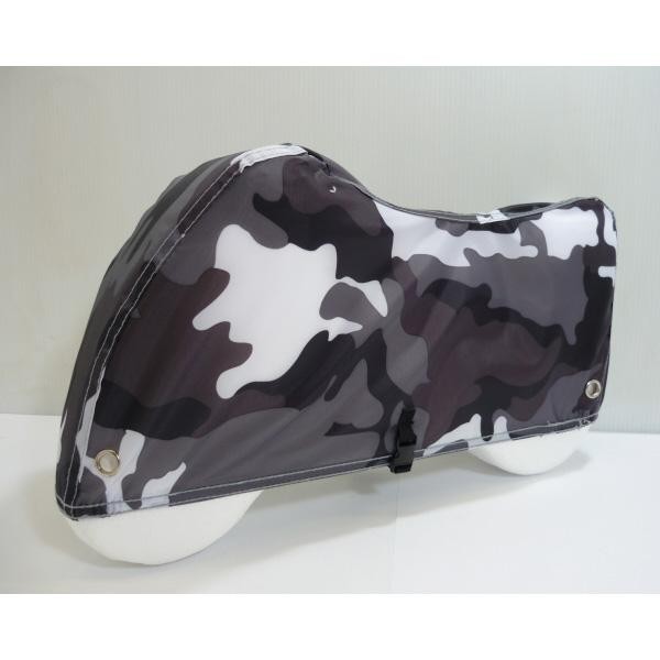 | オックス150D生地を使用した迷彩柄のバイクカバーです。カバーの上からU字ロックやワイヤーロックが前後に取り付け可能。ワンタッチの風飛び防止ベルトを装備しています。 |