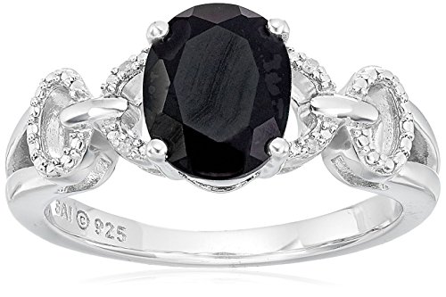 Sterling silver ring featuring split shank, diamond accents on cutouts, and faceted onyx centerpiece