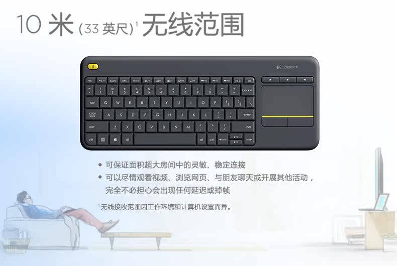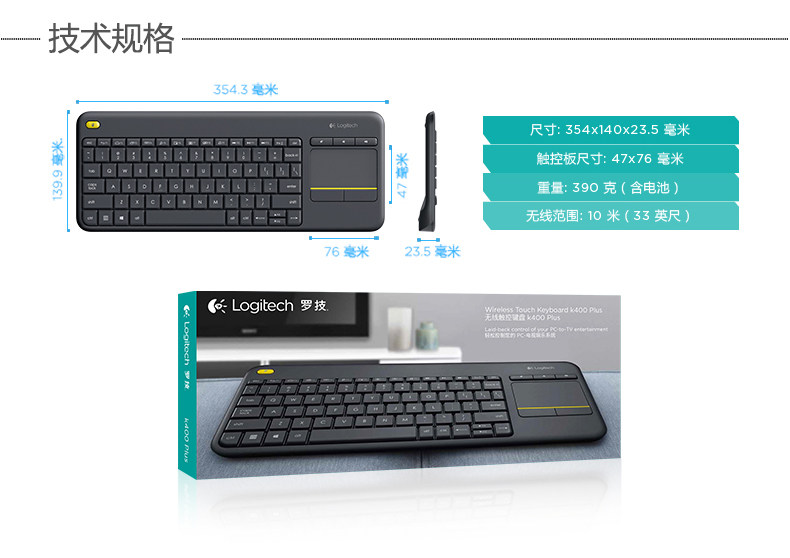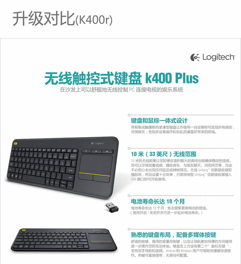 Logitech K400 PlUS Wireless Touch Keyboard KB (Upgraded model of K400r) Comes with touchpad mouse combo K400plus with Built-In Touchpad for Internet-Connected TVs Muti-media Win8