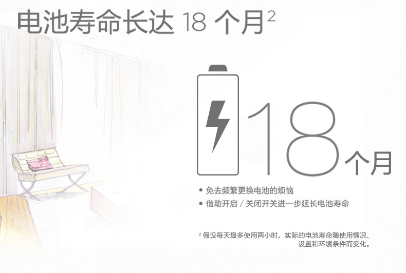 18 months battery life*: Goes for well over a year without changing batteries. (* Assumes up to two hours typing per day. Actual battery life vary with u se, settings and environmental conditions)
