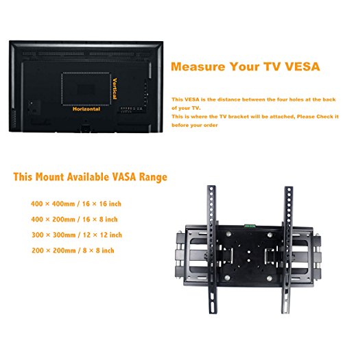 -. Feature : fits most 26 27 32 37 40 42 43 46 47 50 51 52 55 flat panel TV, but please note that the screw is not suitable for Samsung TV / VESA compiance: 200x200mm, 200x400mm, 300x300mm, 400x400 / Load capacity: 110ibs (50kg) / Tilted angle: up and down 15°, Left and right 120° / Arm length: 500mm
