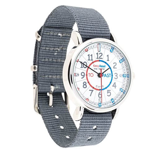 -. Feature : EasyRead Time Teacher children's watch, 1.3" diameter, with red, blue & grey face, slate grey fabric strap and metal buckle. / Designed to help children learn to tell the time in terms of 'minutes past' and 'minutes to' the hour. Supplied with simple 3-step teaching system instructions, easy to learn, compatible with EasyRead Time Teacher clocks. / Battery operated, Seiko PC21s movement, stainless steel back, durable IPS plating (non allergenic). Battery included. / Water resistant. Can withstand splashing, but not total immersion. / Washable fabric strap, 0.6" wide by 8.5" long. Fits wrists from 4.7" to 7" circumference (small child to medium adult).
