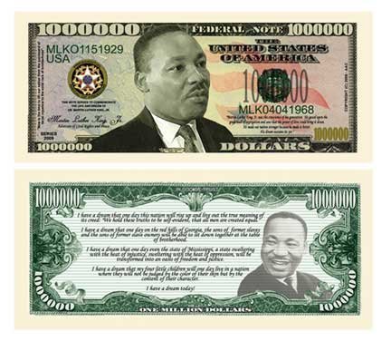 Product Description You get 5 bills and 1 plastic bill protector in this deal .Special Million Dollar Bill featuring Martin Luther King, Jr.!! OWN A PART OF HISTORY! 0