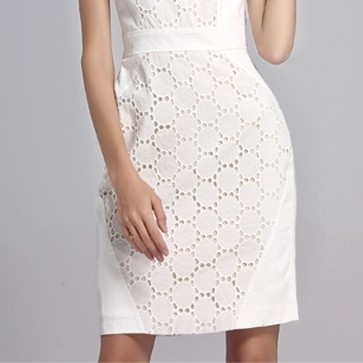 ワンピース ひざ丈 パーティードレス ホワイト レース切り替え ノースリーブ サークルデザイン 大人 お呼ばれ drgz2674
