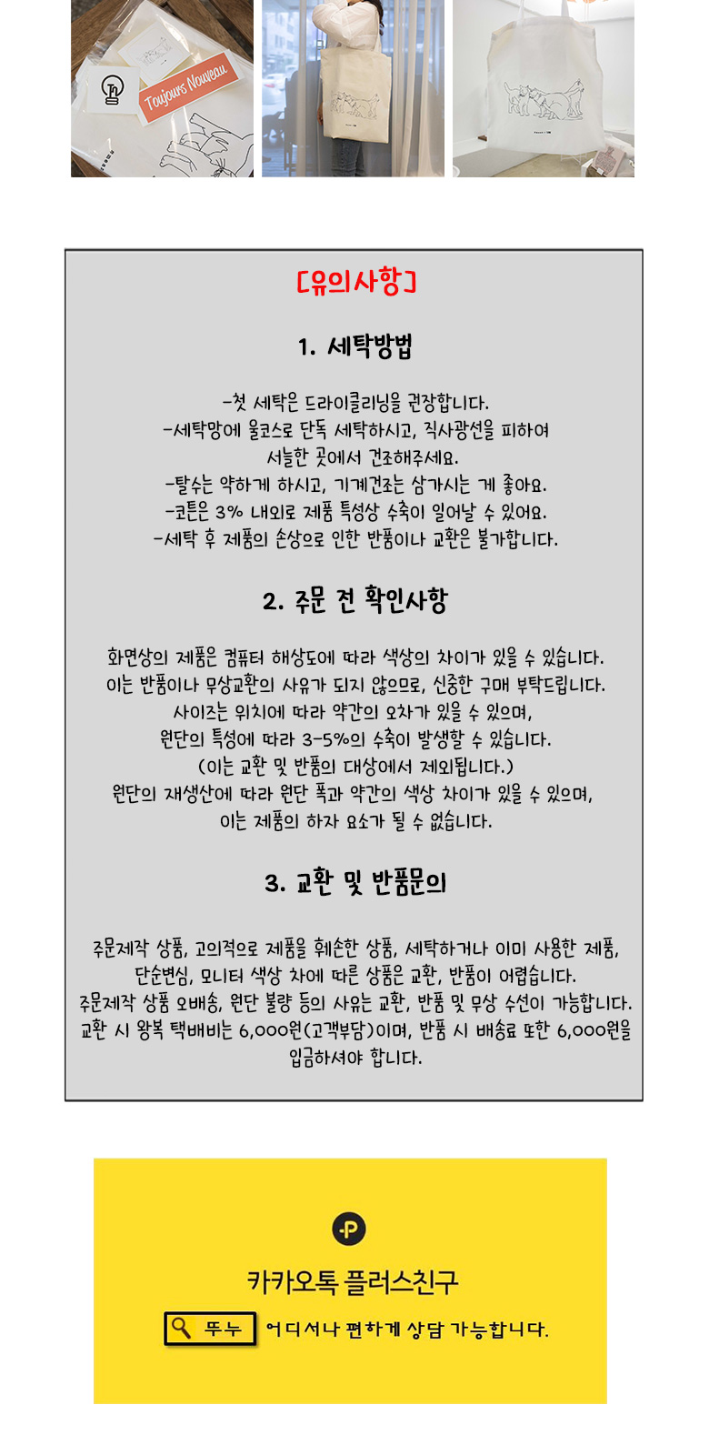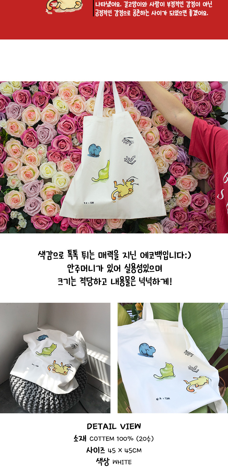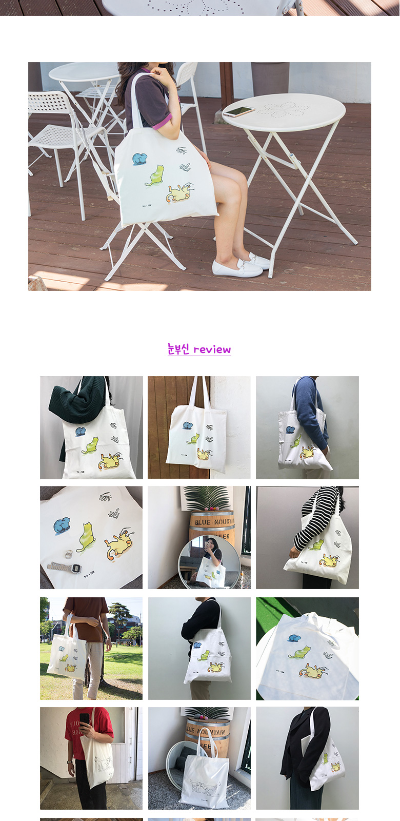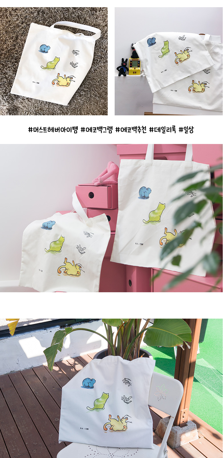 - 주문시 유의사항 : 화면상의 제품은 컴퓨터 해상도에 따라 색상의 차이가 있을 수 있습니다. 이는 반품이나 무상교환의 사유가 되지 않으므로, 신중한 구매 부탁드립니다. 사이즈는 위치에 따라 약간의 오차가 있을 수 있으며, 원단의 특성에 따라 3-5%의 수축이 발생할 수 있습니다. (이는 교환 및 반품의 대상에서 제외됩니다.) 원단의 재생산에 따라 원단 폭과 약간의 색상 차이가 있을 수 있으며, 이는 제품의 하자 요소가 될 수 없습니다. 20수 면100% 디자인 에코백입니다. 넉넉한 크기에 부드러운 소재라 촉감도 좋으며 데일리룩을 완성시킬 에코백이랍니다:)