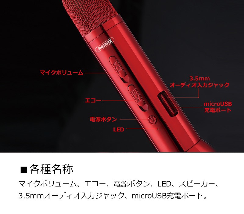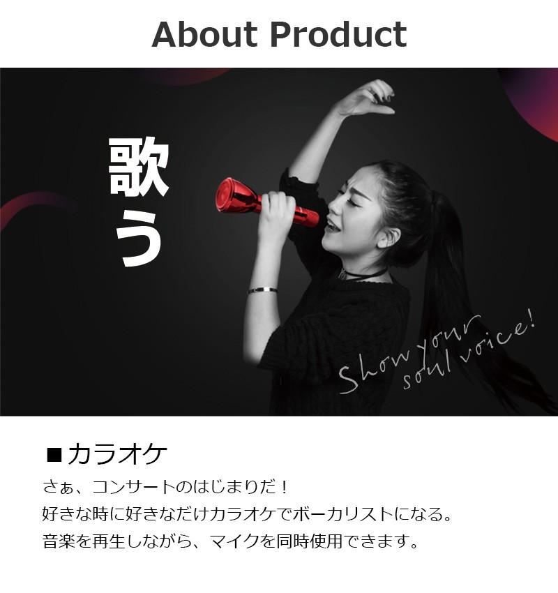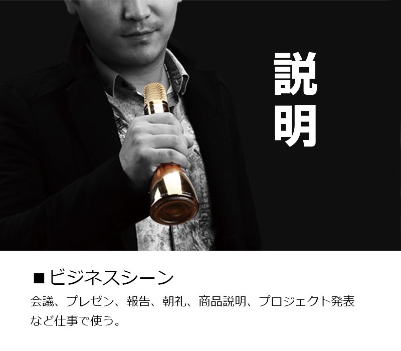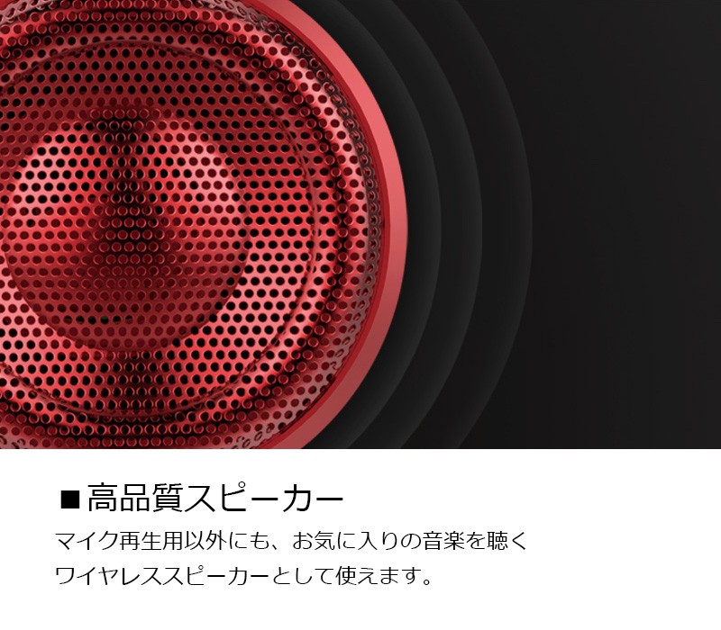| 司会・カラオケ用などとしてご利用いただける、スピーカー内蔵マイクです。 エコーがきくため、ご自宅でのカラオケもお楽しみ頂けます。 また、スピーカーのみとしてのご利用も可能となっております。 |