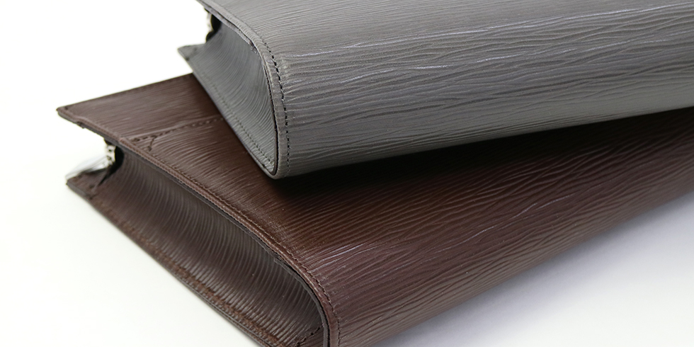 ポイントはワックスとアイロン工程によるツヤ出し加工で、海面に光があたる様を表現するべく波(型押し)の凹凸部で光沢の差を出しています。ハリ感があり、洗練された印象のスマートなレザーです。