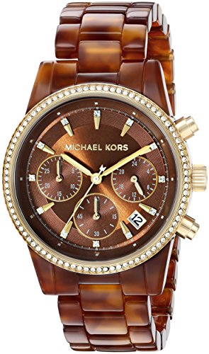 -. Feature : Gold-tone watch with crystal-bordered bezel and brown sunray dial with three subdials, date window, and crystal hour markers / 37 mm stainless steel case with mineral dial window / Quartz movement with analog display / Three-link resin bracelet with fold-over clasp with double push-button safety / Water resistant to 50 m (165 ft): In general, suitable for short periods of recreational swimming, but not diving or snorkeling
