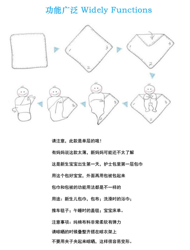 2、宝宝抵抗力比较弱,又经常要换尿布。把宝宝直接放在床上容易弄脏床单,洗起来麻烦;放在成人的腿上不卫生;放在桌子上会让宝宝屁股着凉。用这么一张抱被垫在下面就方便多了,既保暖又不弄脏床,清洗方便又卫生,外出也别忘了带上哦。