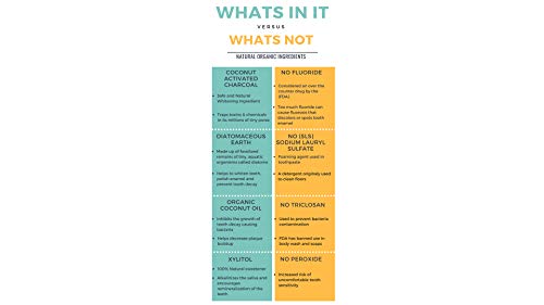 ✅ POWERFUL NATURAL INGREDIENTS - Water, Diatomaceous Earth, Xylitol, Organic Coconut Oil, Coconut Activated Charcoal, Baking Soda, Citric Acid, Peppermint Essential Oil, Tea tree Essential Oil, Xanthan Gum