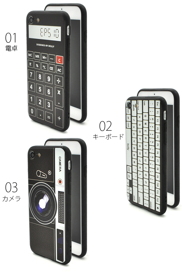 電卓・キーボード・カメラの3種類の製品をプリントしたフェイクケースです。