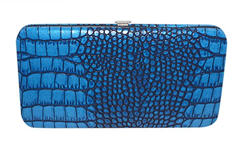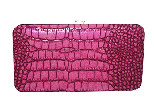 Trendy hard case clutch wallet with faux snakeskin leather print on front and back.
