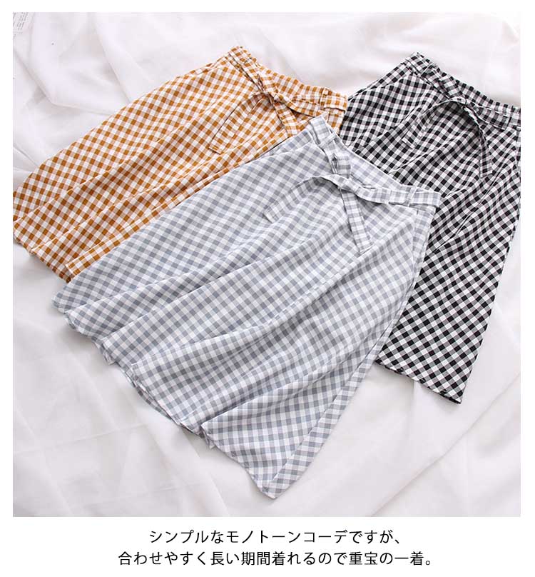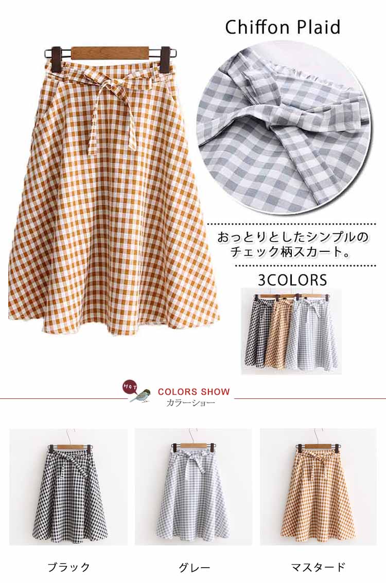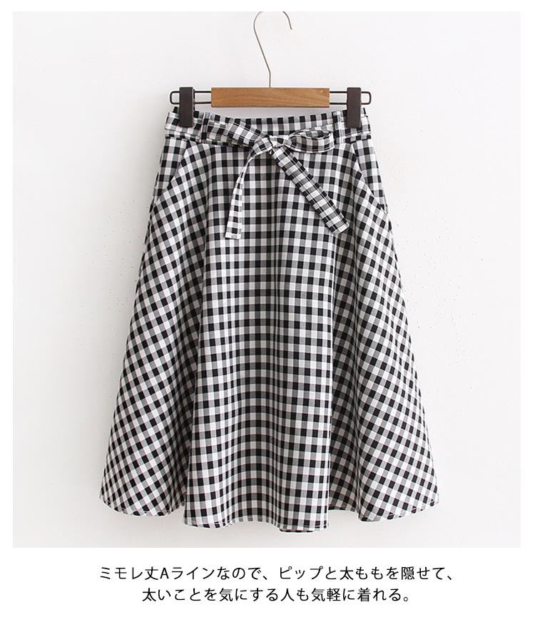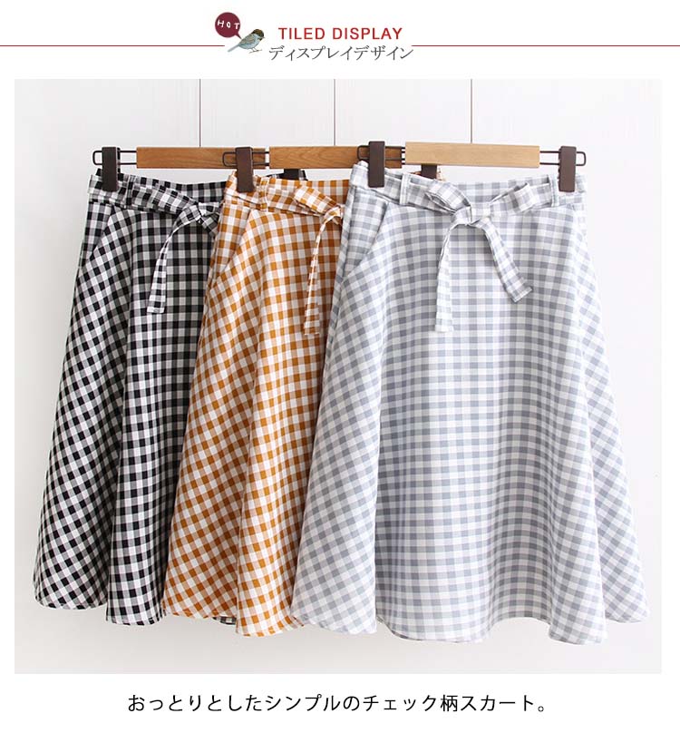 | おっとりとしたシンプルのチェック柄スカート。ウエストでリボンできるデザイン、活発でキュートなイメージに。ミモレ丈Aラインなので、ピップと太ももを隠せて、太いことを気にする人も気軽に着れる。シンプルなモノトーンコーデですが、合わせやすく長い期間着れるので重宝の一着。 | |