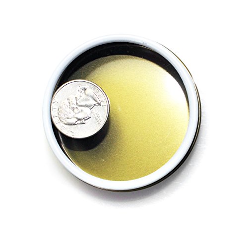 FULL DIMENSIONS : Diameter measures 2-7/16 inches. Height is 13/16 inches. White exterior with gold interior seamlessly formed 2 oz tin can.