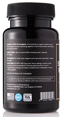 -. LegalDisclaimer : WARNING: Do not use if pregnant, nursing, or under the age of 18. Consult with a healthcare professional before use, especially if you have or suspect you may have a medical condition or if you are taking any medications. Immediately discontinue use and contact a physician if you experience any adverse reactions. KEEP OUT OF REACH OF CHILDREN. DISCLAIMER: The statements and products referred to have not been evaluated by the Food & Drug Administration (FDA). They are not intended to diagnose, treat, cure or prevent any disease. If you have a health condition or concern, consult a physician or your alternative health care provider. Always consult a medical doctor before modifying your diet, using any new product, drug, supplement, or doing new exercises. FESTAID's Super 5-HTP B-Complex is intended to help maintain a healthy lifestyle. FESTAIDTM does not in anyway condone or advocate the use of any illegal substances.