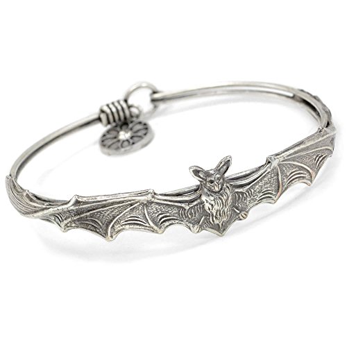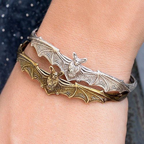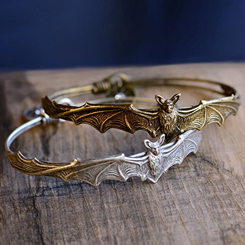 "Forever a symbol of darkness, the bat is featured throughout my jewelry collection. This little vampire bat stretches his wings to encircle your wrist, mounted on a delicate hardwire bracelet. He's a pinch of mystery, a hint of spooky, a bit of witchcraft and will accompany you all year round." Nothing quite says Mistress of the Dark or Queen of Halloween like a bat. Though their reputations are shrouded in fiction, bats are essential to the ecosystem and their secret lives are fascinating. Magnificently constructed, their graceful form has been expressed in every decorative art. Bats as symbols, convey extra sensory perception, determination and stealth. Who doesn't need a little of all three? Your choice of burnished bronze or silver. Easy hook closure. Hand fabricated in our Los Angeles studio.Feature