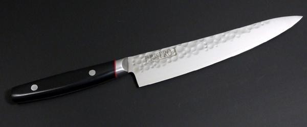 ブレードの表面に美しい模様の「鎚目鍛造ブレード」加工を施した包丁です。日本らしさを残した直線的なフォルムに、エレガントな曲線を加えたデザインに。ハンドルは人間工学を考えた寸法関係にしているので、非常に持ちやすいデザインです。 |