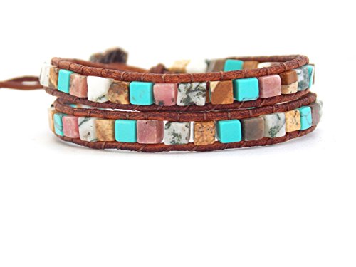 The earthy mix of color are carefully sewn onto two strands of leather. Making it durable, yet soft and light weight. This adorable wrap bracelet is not only cute, it's also comfortable to wear
