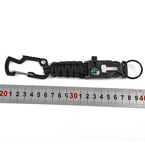 STRONG, DURABLE AND VERSATILE: Our multifunctional 550 Paracord Keychains Lanyard Keychains measures 7.8 inches in length and 1.0 inches in width with Carabiners, Fire starter, Whistle, Compass and bottle opener.