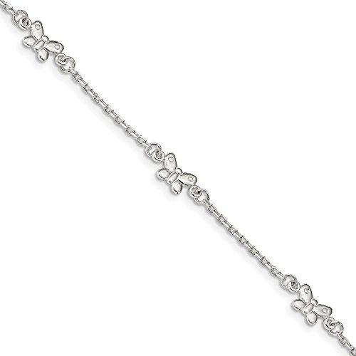 Anklets are a great way to add fun, flash and a feminine touch. This polished station design made from sterling silver features a 1.5mm solid link cable chain with 6 x 10mm butterfly link stations. It is adjustable in length from 9 to 10 inches and closes with a fancy lobster clasp.Feature