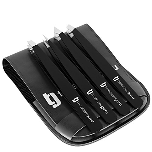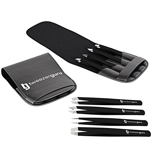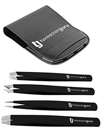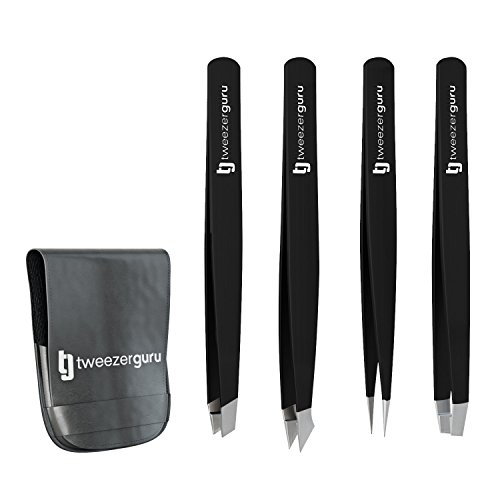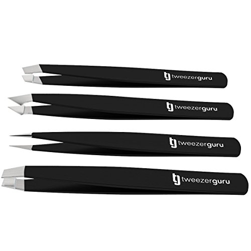 Tweezers Set 4-piece - TweezerGuru Stainless Steel Slant Tip and Pointed Eyebrow Tweezer Set - Great Precision for Facial Hair, Ingrown Hair, Splinter,...