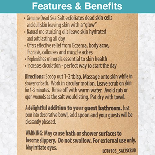 - GENTLE, HEALING EXFOLIATION – Perfect to combat skin conditions like: eczema, psoriasis, and dry skin. Using our Salt Scrub a few times a week will gently slough off dead skin cells while minerals like Bromide, Magnesium Sulfur, and Zinc heal your skin.