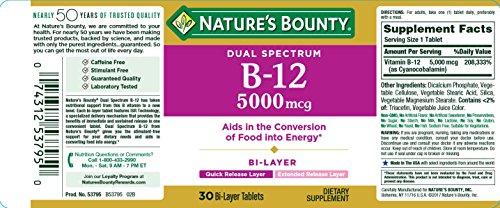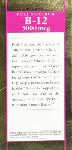 ReleaseDate : 2014-03-01 Studio : Natures Bounty Publisher : Natures Bounty Binding : Health and Beauty Product Description Nature’s Bounty Dual Spectrum B-12 is an innovative way to support energy by converting food into energy.* Each bi-layer B-12 tablet features ISR technology, a scientifically engineered delivery mechanism that offers the benefits of both immediate and sustained release (ISR). Each tablet has two distinct layers ? one to deliver effective, quick release, and one designed to release B-12 in your body over the course of several hours…when you need it most! 0